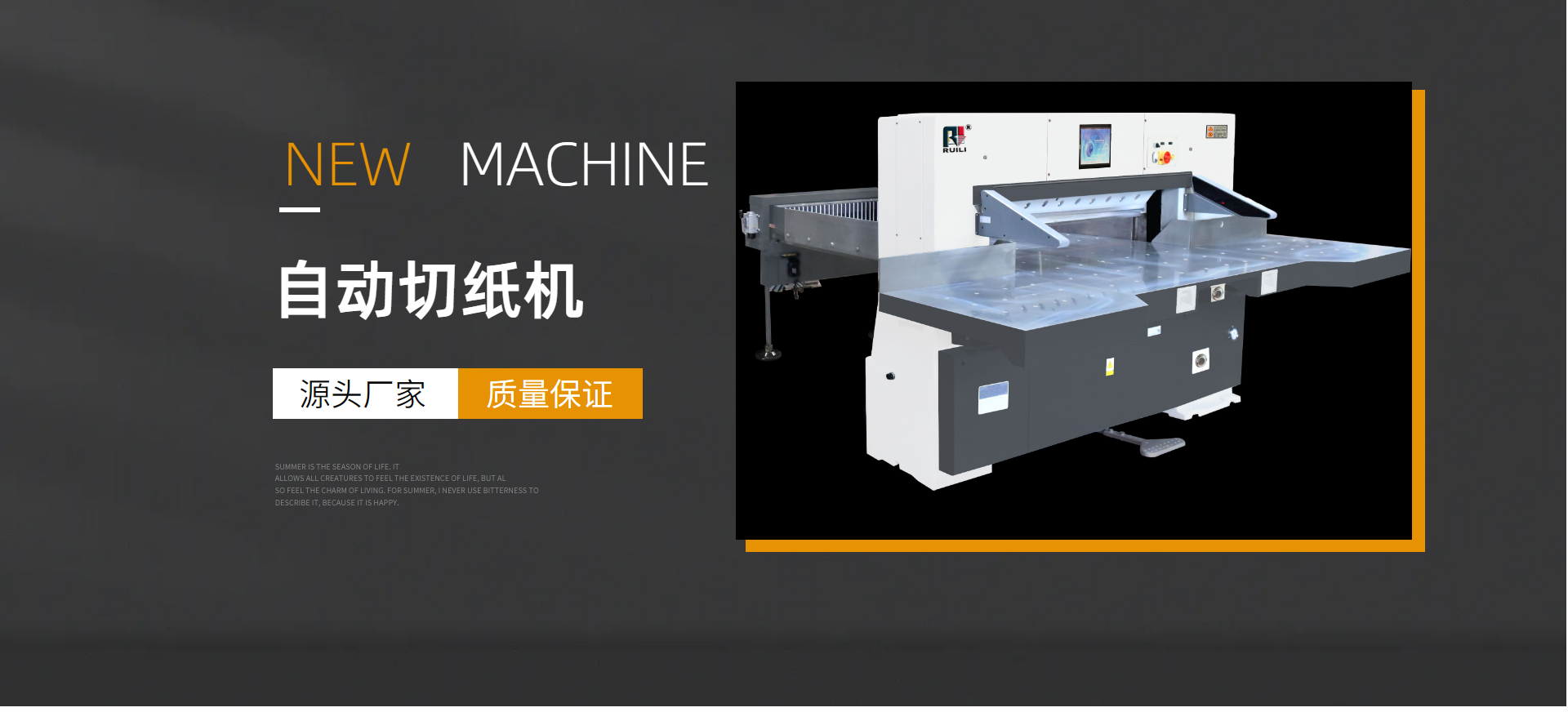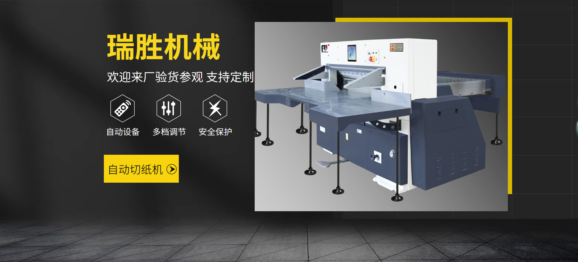 瑞安市瑞勝機(jī)械有限公司是一家專(zhuān)業(yè)集“生產(chǎn)、銷(xiāo)售、服務(wù)”于一體的印刷包裝機(jī)械企業(yè);有二十余年專(zhuān)業(yè)制造切紙機(jī)的經(jīng)驗(yàn),在切紙機(jī)行業(yè)中享有較高聲譽(yù)。研制出集光、機(jī)電、液為一體的高性能高品質(zhì)的切紙機(jī)系列產(chǎn)品,主要產(chǎn)品有電腦切紙機(jī),雙液壓電腦切紙機(jī),雙導(dǎo)軌數(shù)顯切紙機(jī),快捷式壓痕機(jī)系列,覆膜機(jī)、上光機(jī)、燙金機(jī)等系列產(chǎn)品。